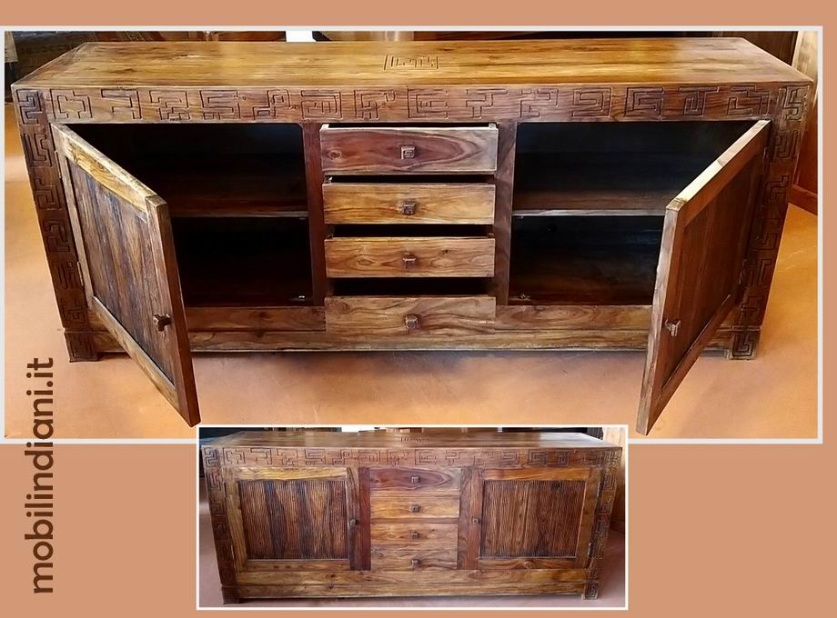 Disponibilità 1Credenza indiana con 2 ante intagliate + 4 cassetti centrali, molto capiente. Linea essenziale moderna. Realizzata in legno massello di sheesham (noce) con splendide venature. Cm.200x45 h.86 PER INFO COSTI SPEDIZIONE CHIEDI su WhatsApp o via mail: info@mobilindiani.it