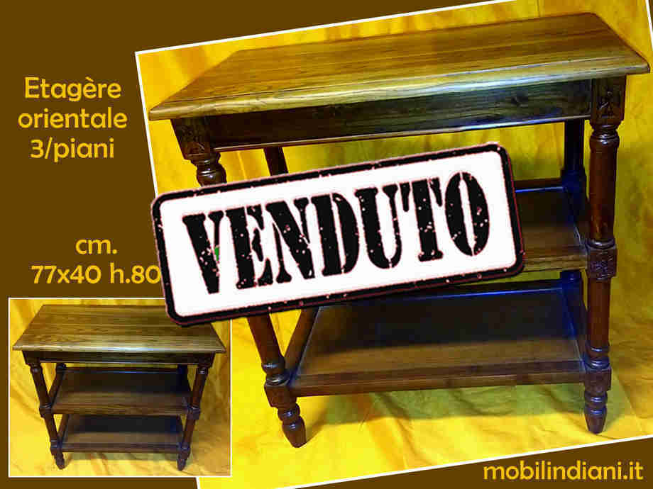Disponibilità 0Mobile etnico in legno orientale. Mobile etagère 3 ripiani. Gambe in legno tornito. Cm.77x40 h.80 Legno olmo dell'Himalaya. Paese Cina