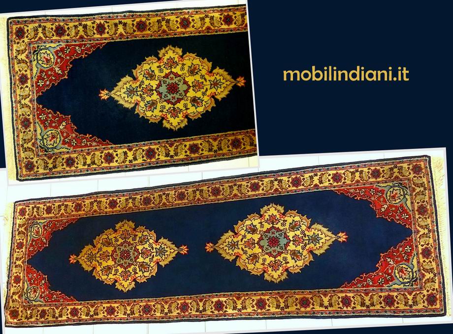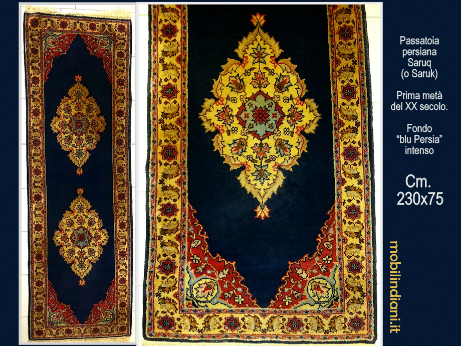 Disponibilità 1Passatoia persiana Saruq (o Saruk) Epoca prima metà XX Secolo. Fondo "blu Persia" intenso, medaglioni centrali e bordura floreale color crema. Cm.230x75 Tappeto pregiato di solidità struttura, lana soffice, eccellente e compatta (vedi foto) caratteristiche che li hanno resi famosi in tutto il mondo. Il tappeto Saruq, rientra nelle categorie più alte di tappeti persiani. COSTO TRASPORTO €. 29,00 Iva Inclusa. Per costi trasporto Isole, chiedi info su WhatsApp o mail: info@mobilindiani.it