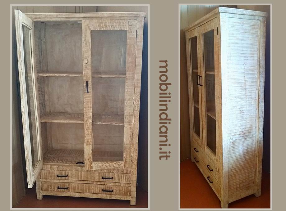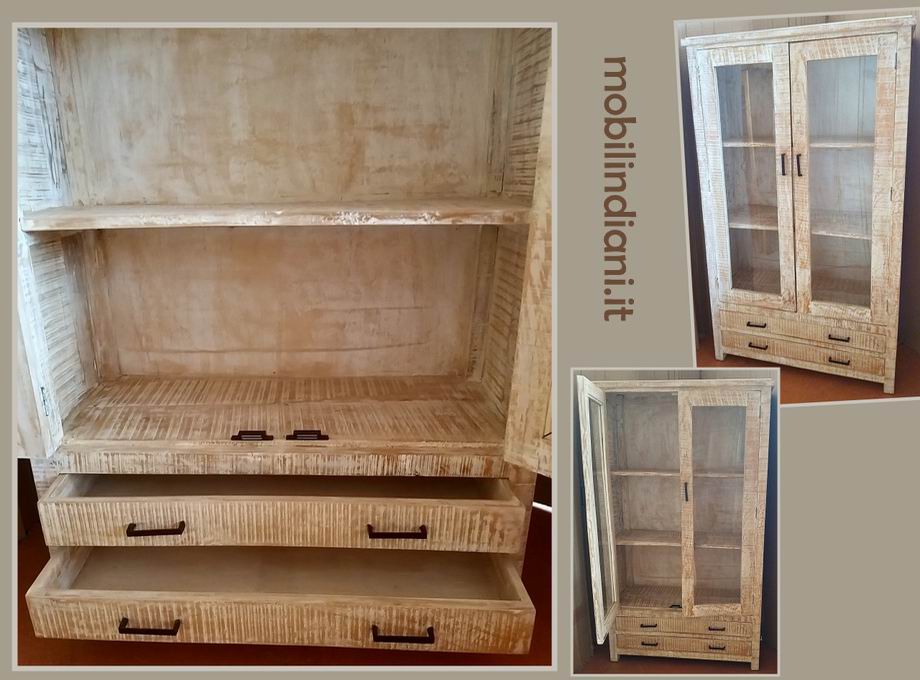 Vetrina indiana in legno di mango finitura decapata, realizzata artigianalmente 2 ante a vetro + 2 cassetti, maniglie in ferro. Cm.45x82 h.180 Paese di provenienza Rajasthan, India PER INFO COSTI SPEDIZIONE CHIEDI su WhatsApp o via mail: info@mobilindiani.it